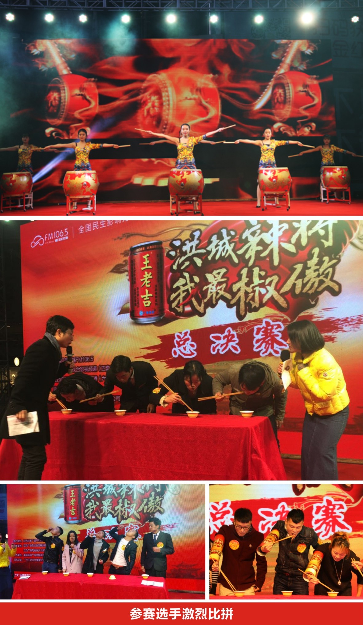 总决赛的舞台上,各路参赛选手展现出了极高的吃辣实力与争冠欲望,大伙当仁不让、火力全开,热辣激情的比赛氛围贯穿始终。最终,经过三小时的交锋角力,辣将桂冠及二、三名尘埃落定。广州王老吉大健康企业发展有限公司销售部副总监夏军、市场部副总监梅吉文、江西广播电视台都市频率总监吴立芳分别为获奖选手颁奖。